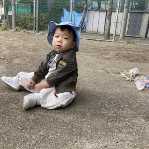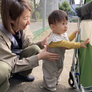 初めてグラウンドでハイハイをして土の感触を感じたり、つかまり立ちを楽しんだりするお友だちや