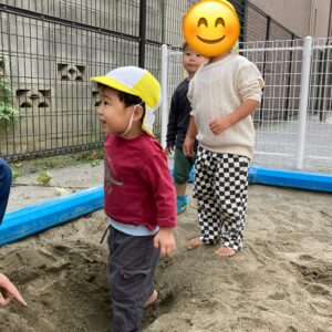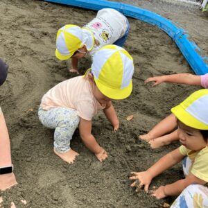 みんなで穴を掘ってその中を進んでみたり、足を砂の中に入れてみたりとお友だちや保育者と考えながら、色々なあそび方で砂あそびを楽しんでいました!