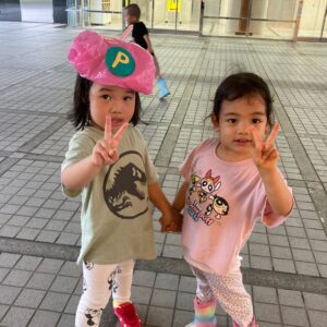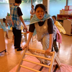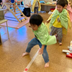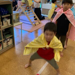 ピーマンマンのマントをつけて、なりきってあそんでいます。