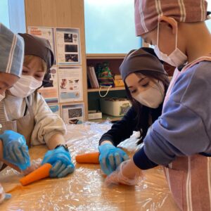 この中のおにぎりを握ったり、豚汁に使うお野菜を切ったり、型抜きをしたりしました。