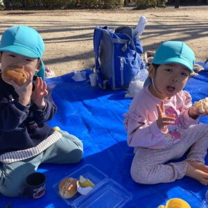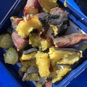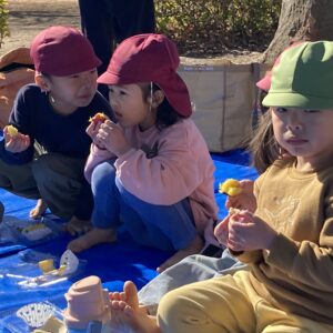 青空の下で、皆んなで作った焼き芋とお弁当でピクニックは