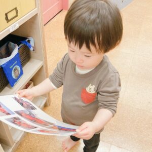 場所見知りも始まっていたお友だちで、不安そうにお母さんとゆっくりお部屋に入るか迷っていると…大好きな車の写真の載った壁面を見つけ、目をきらきらと輝かせながらお部屋の中にすっと入ることができました!