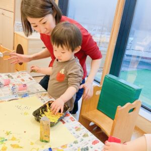 保育者が絵の具をチューブから出しているのを不思議そうな表情にならながら見つめたり、大胆に絵の具の入ったお皿をひっくり返してみたりとお家ではなかなかできない体験をすることができました。